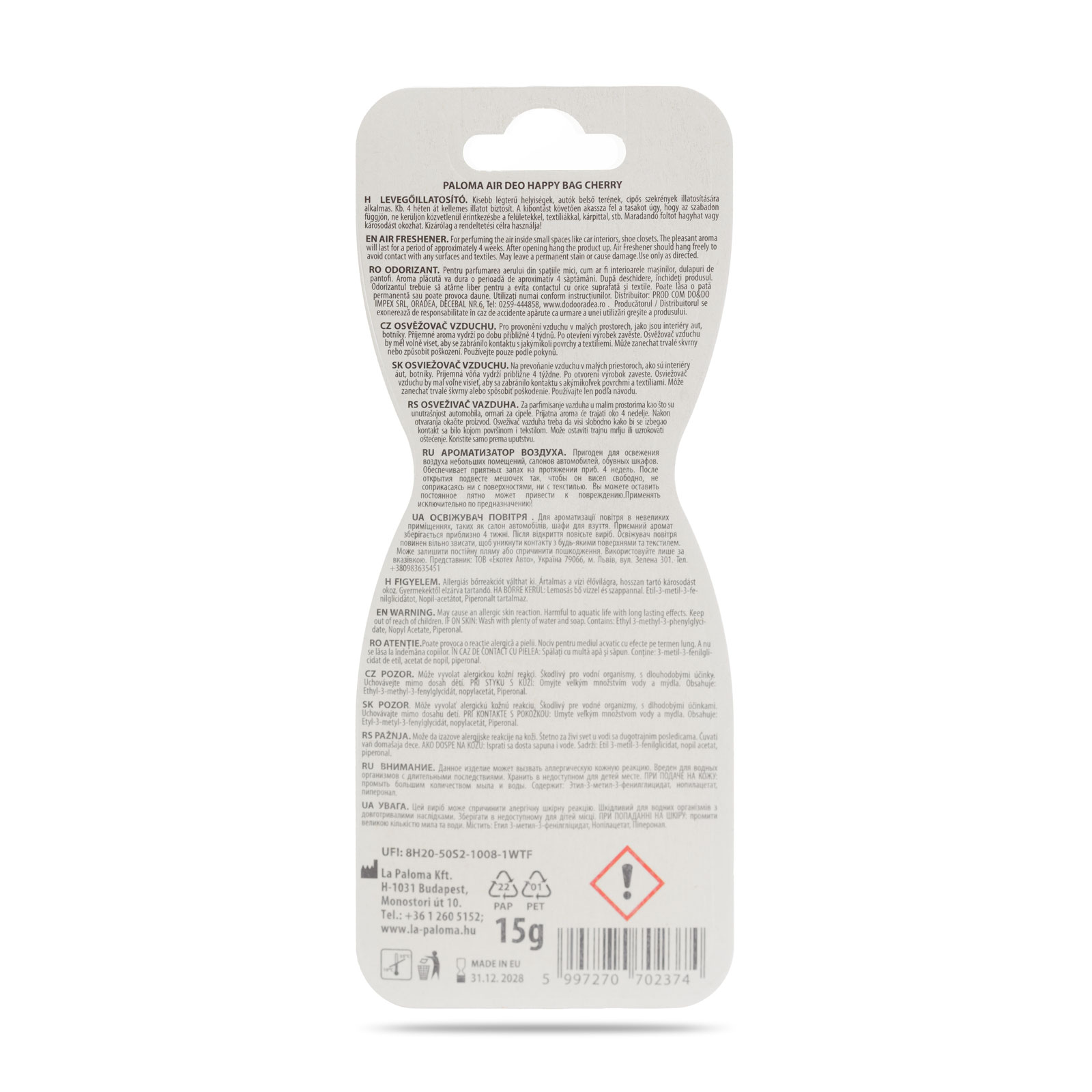 În concluzie, Paloma Happy Bag – Cherry este soluția ideală pentru a aduce aroma dulce a cireșelor în mașina ta sau în camera ta. Transformă-ți spațiul într-un loc plin de dulceață și savoare cu acest produs plin de aroma delicioasă!