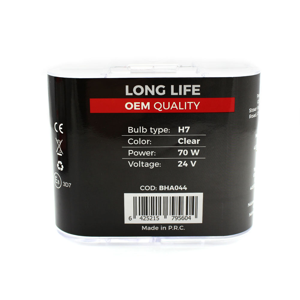 CARGUARD Set de 2 becuri H7 LONG LIFE, 70W – Alb Xenon, intensitate luminoasă cu 50% mai mare! Becurile sunt confecționate din sticlă de calitate superioară și beneficiază de o durată de viață prelungită, datorită unei tehnologii avansate de producție. Caracteristici: Tip Bec: H7 Tensiune de lucru: 24V Putere: 70W +50% Intensitate 2 buc/ set.