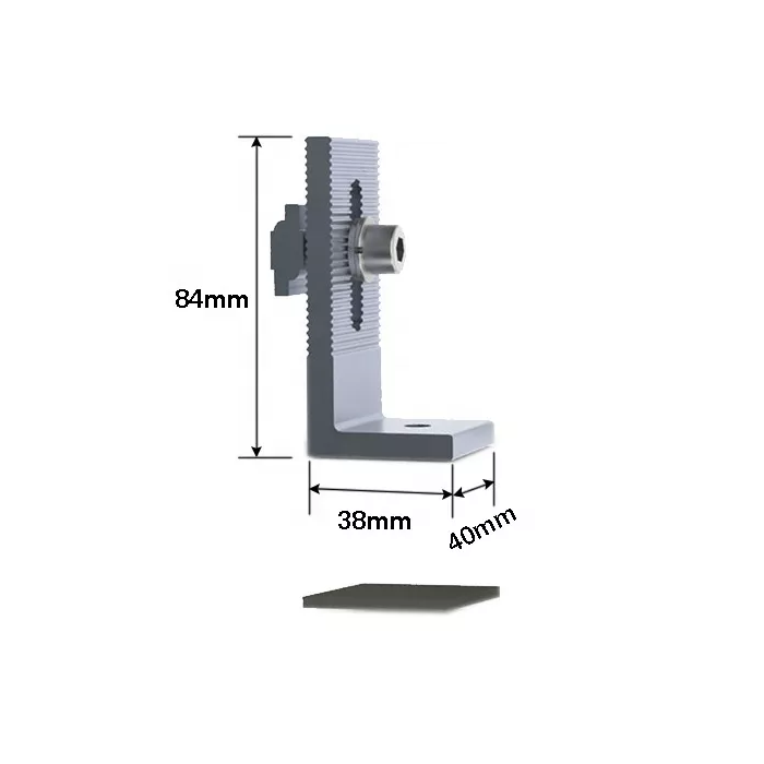 Suport „L” pentru fixare panou fotovoltaic pe acoperiș de tablă Kit complet cu Nut, Surub si cauciuc EPDM. Dimensiuni: Inaltime: 84mm Latime: 38 mm Latime: 40 mm Material: Aluminiu 6005-T5
